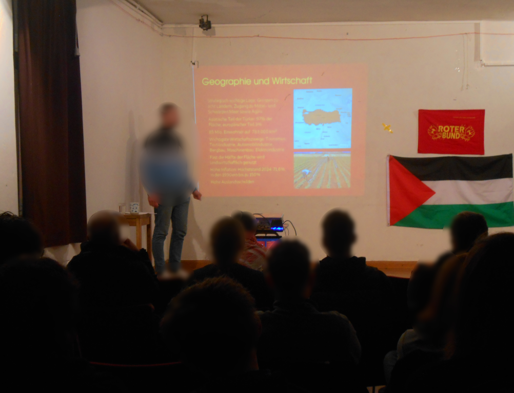 Am 13.12. führte der Rote Bund Bremen eine erfolgreiche Veranstaltung zum aktuellen Klassenkampf und politischen Situation in der Türkei durch. Es wurden ausgehend von der Darstellung der Türkei als halbfeudales und halbkoloniales Land aktuelle Kämpfe des Volkes in Stadt und Land gezeigt. Auch wurde auf über die Geschichte der Türkei und der Revolution in der Türkei, untrennbar verbunden mit TKP/ML berichtet. Das heldenhafte Leben des kommunistischen Führers Ibrahim Kaypakkaya wurde bildhaft gemacht und ein großer Teil nahm auch die Darlegung der Position der Kommunisten zur Kurdenfrage in der Türkei ein, basierend auf der gleichnamigen Schrift Genosse Kaypakkayas.
