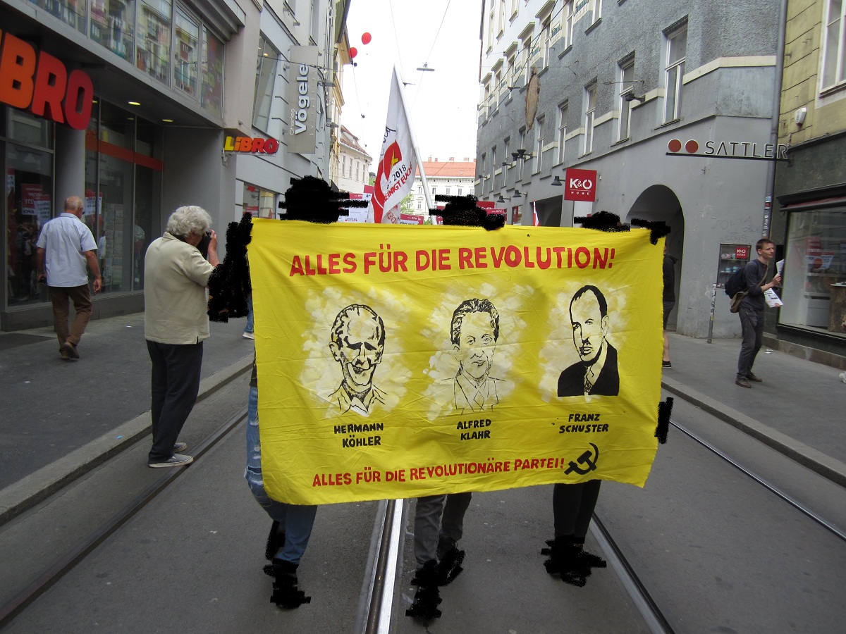 Der 1. Mai 2018 leitete eine große Kampagne zum 100 Jahrestag der Kommunistischen Partei Österreichs (KPÖ) ein, die in Transparten, Plakaten und Flyern einen kraftvollen Ausdruck fand. In vier Bundesländern wurden Transparente mit den 12 Helden des Zentralkomitees der Kommunistischen Partei Österreich, die allesamt von den Nazi-Faschisten ermordet wurden, hochgehalten. Die Losung „Alles für die Revolution! Alles für die Revolutionäre Partei“ gab die weitere Orientierung für die revolutionären Kräfte über ihre Aufgaben im kommenden Kampfjahr: Die Rekonstitution der Kommunistischen Partei mit aller Kraft voranzutreiben!
