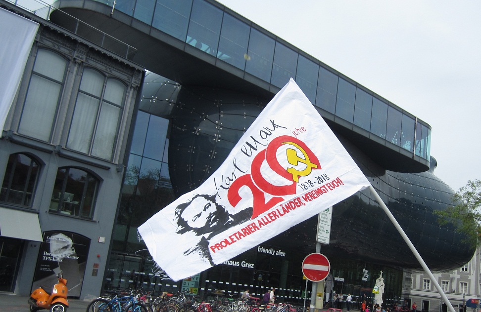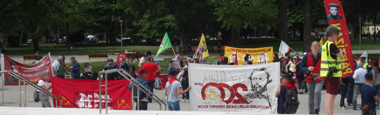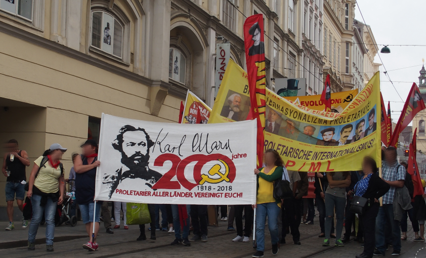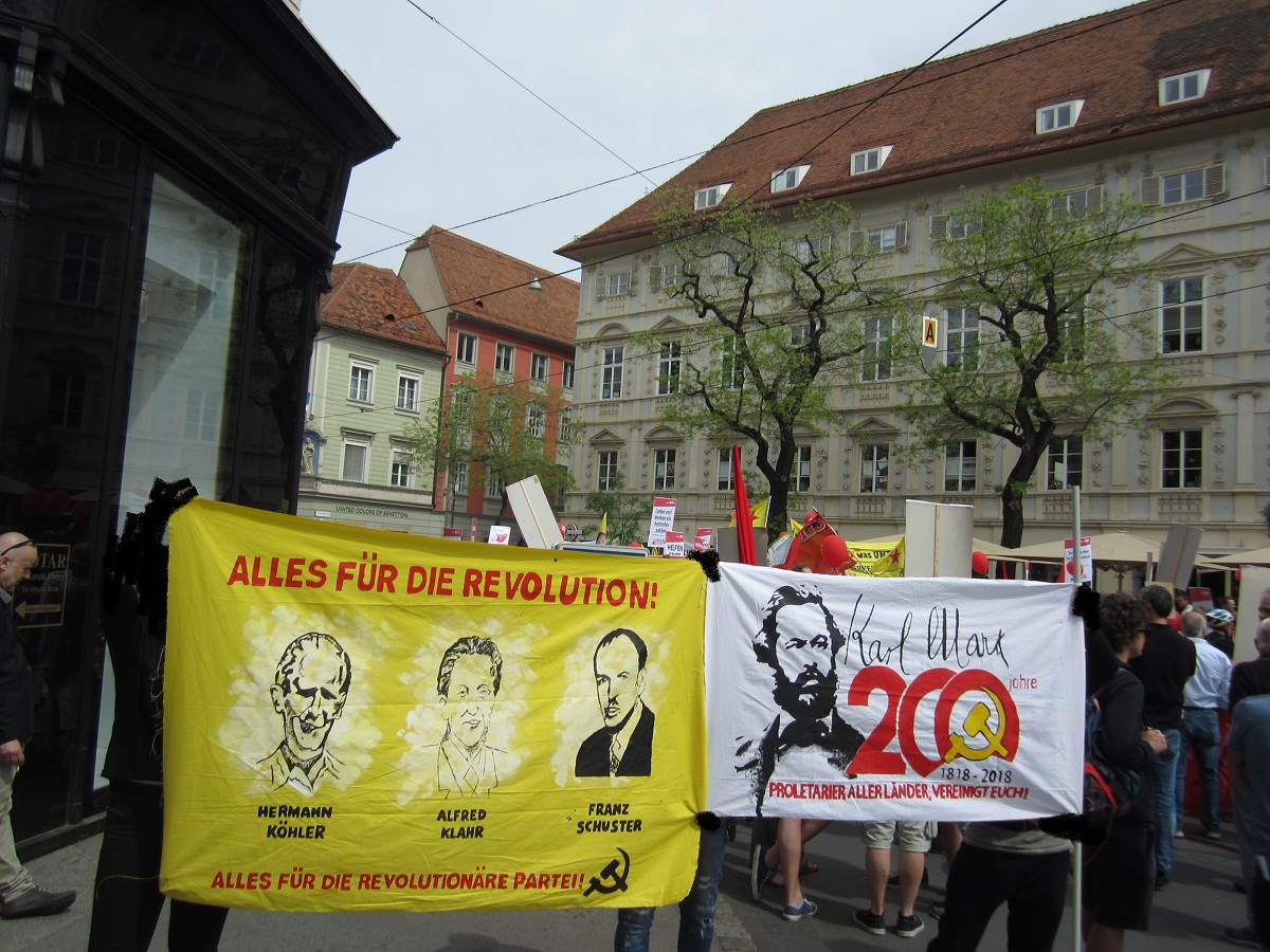 Linz - Auf der diesjährigen 1.Mai Demonstration in Linz gab es einen starken Ausdruck der maoistischen Kräfte, die gemeinsam die internationale Kampagne zum 200. Geburtstag von Karl Marx repräsentierten! Es beteiligten sich viele neue Leute, vor allem junge Aktivistinnen und MigrantInnen. Die Revolutionäre in Linz unterstützen die Einleitung einer Kampagne zu „100 Jahre Kommunistische Partei in Österreich“. Dazu wurde ein Transparent mit der Losung „Alles für die Revolution! Alles für die revolutionäre Partei!“ getragen, welches die Bilder dreier Helden des Zentralkomitees der KPÖ zeigte: Hedy Urach, Sepp Teufl und Leo Gabler! Außerdem wurden Flyer verteilt, welche im 100. Jahr der Gründung der KPÖ zur Rekonstitution der Kommunistischen Partei in Österreich aufrufen – die, so wurde berichtet, großen Anklang fanden und den AktivistInnen „aus den Händen gerissen“ wurden! Die Stimmung war im allgemeinen sehr gut und kämpferisch. Die Leute die sich beteiligten zeigten großes Interesse an Infomaterial und Flyern.