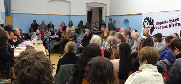 Der große Andrang zur Veranstaltung, an der knapp 90 Leute teilnahmen, zeigt das große Interesse an diesem Thema. Vor allem die sehr unterschiedliche Zusammensetzung des Publikums, viele MigrantInnen aus afrikanischen Ländern unterschiedlicher Generationen, sowie ältere und jüngere AktivistInnen und BesucherInnen aus Österreich, machten die Diskussion zu einer sehr lebendigen Auseinandersetzung: Darüber wie wir den Kampf gegen die Ausplünderung Afrikas unterstützen können. Trotz der unterschiedlichen Zusammensetzung des Publikums einte es sich, als eine rassistische Provokateurin versuchte die Veranstaltung zu sprengen. Vor allem die Jugendlichen starteten mit Zwischenrufen und eine Rednerin auf dem Podium machte deutlich: Genug von der Bevormundung der AfrikanerInnen durch weiße Rassisten! Wir lassen uns das nicht gefallen! Und so wurde die Provokateurin aus dem Raum geworfen.