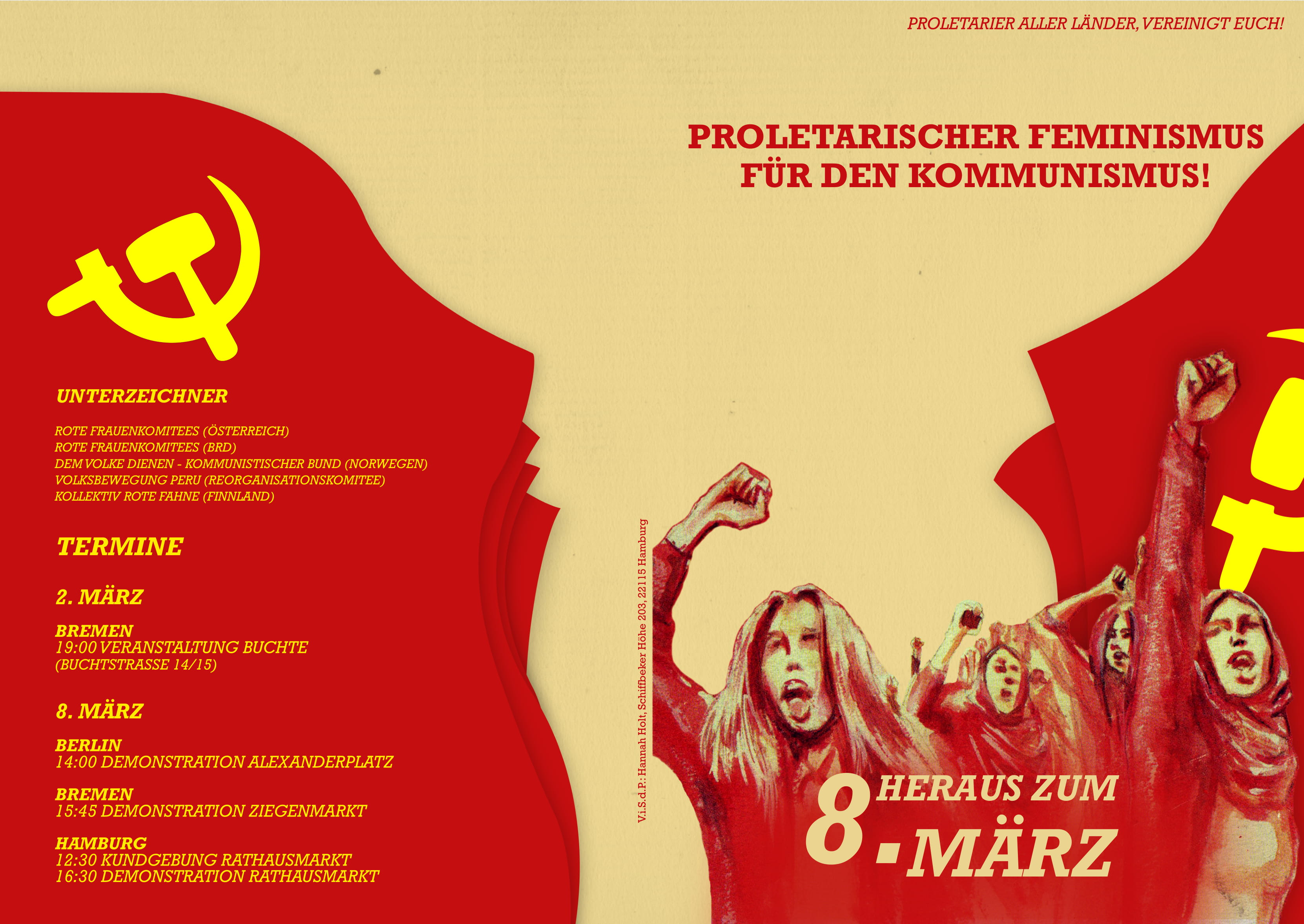 Dieses Jahr entfalten wir Marxisten-Leninisten-Maoisten in Europa gemeinsam unsere Aktivitäten um den 8. März unter den Parolen Proletarischer Feminismus für den Kommunismus! und Welle auf Welle, Schlag auf Schlag – Gegen Imperialismus und Patriarchat!. Wir tun dies mit der Intention die Entwicklung der europäischen proletarischen feministischen Bewegung vorwärts zu bringen und weiter die Wut der Frau als mächtige Kraft für die proletarische Weltrevolution zu entwickeln.