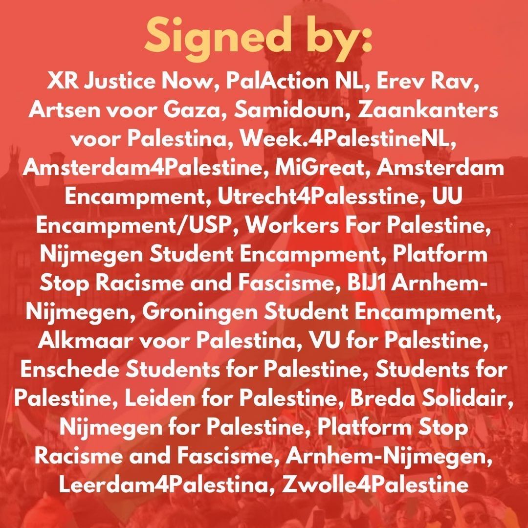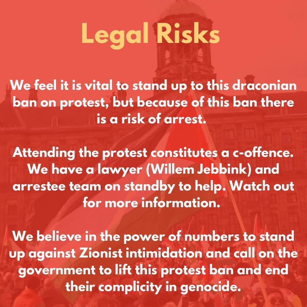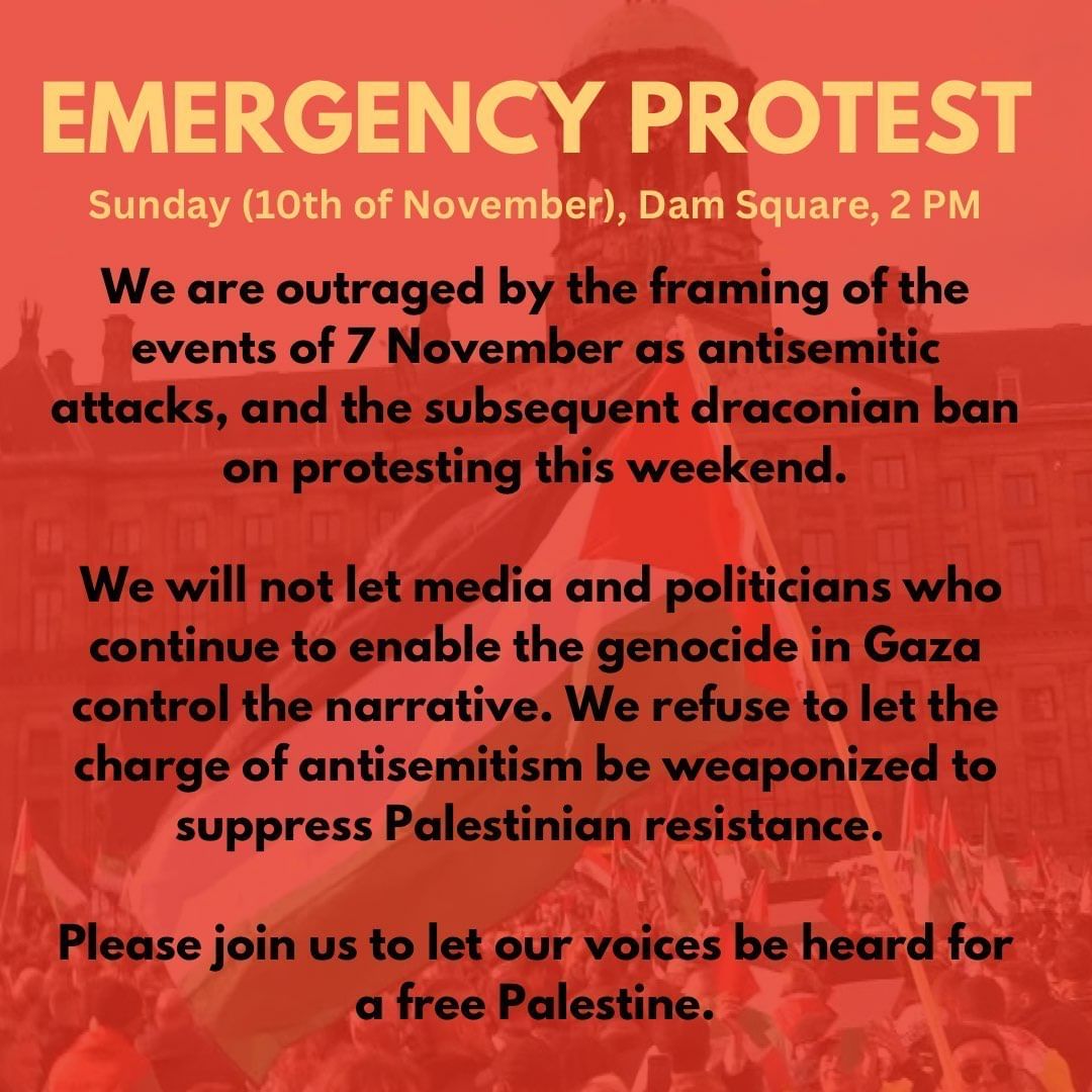 Aufgrund einer größeren BDS-Kampagne gegen die Teilnahme Israels an der UEFA war eine Demonstration von BDS in der Nähe des Stadions geplant. Doch anstatt die Demonstration zu ermöglichen, beschloss der sozialdemokratische Bürgermeister Halsema, die Demonstration zu verbieten und sie stattdessen in einen weit entfernten Park zu verlegen. Doch die Wut der Massen lässt sich nicht durch staatliche Repressionen eindämmen. Wenn man wirksame Proteste unmöglich macht, werden wir unsere Wege finden.