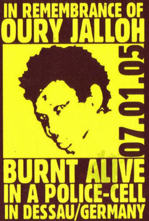 Am 7. Januar 2005 starb Oury Jalloh an Händen und Füßen gefesselt in einer Zelle der Polizei in Dessau. Er wurde verhaftet, weil er schwarz war. Er wurde gefoltert, weil er schwarz war. Er wurde bei lebendigem Leib verbrannt, weil er schwarz war. Anlässlich seines elften Todestages gab es verschiedene Aktionen in der BRD. Die zentrale war die jährlich stattfindende Demonstration in Dessau.