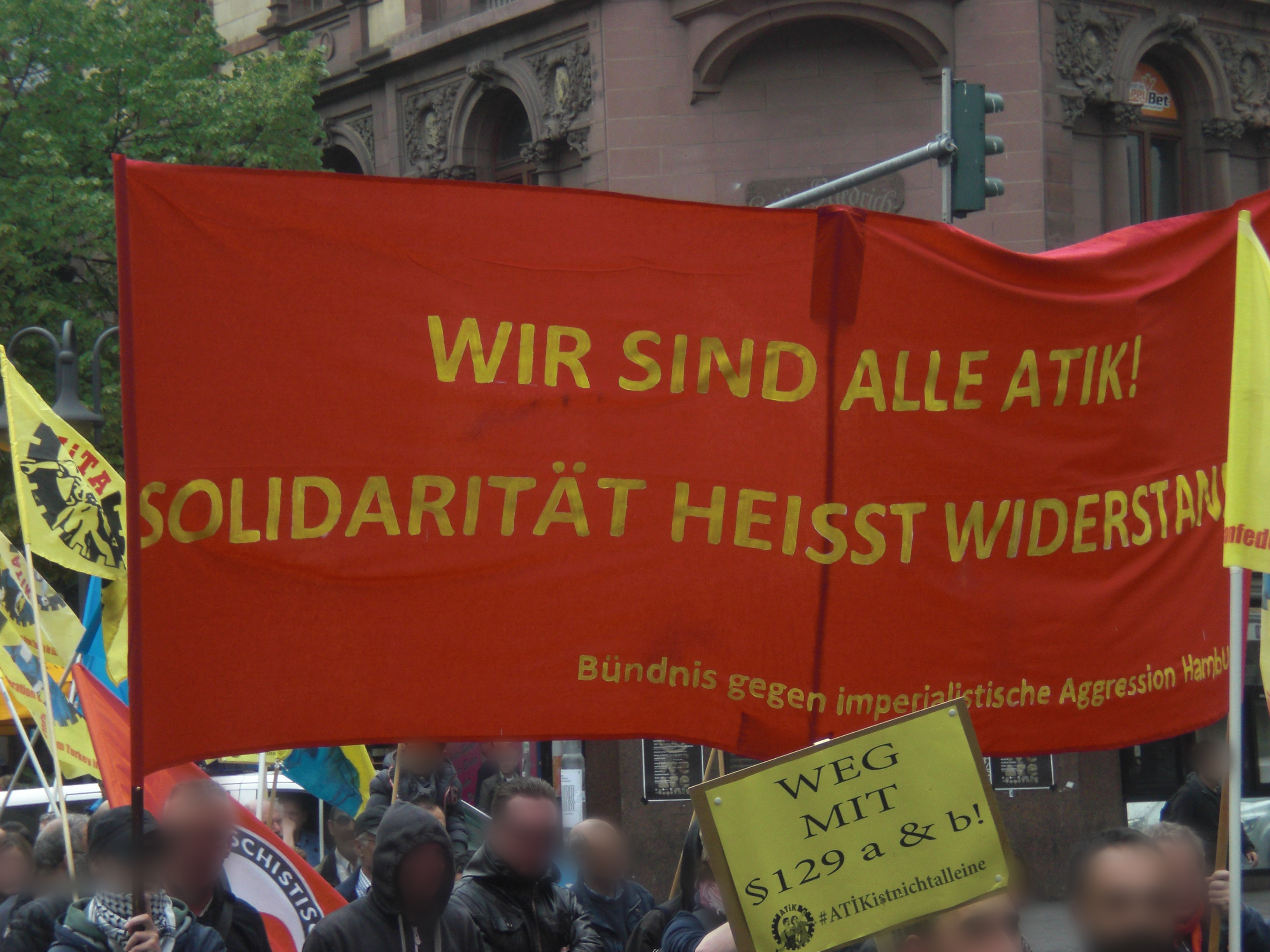 In Frankfurt sind am vergangenen Samstag, den 26. April 1.000 Leute gegen die Inhaftierung von Genossen der demokratischen Arbeitervereinigung ATIK auf die Straße gegangen. Unter den Parolen „Hoch die Internationale Solidarität“, „Schulter an Schulter gegen Faschismus“, „wir sind alle ATIK“ und gegen den Paraghrapen 129 (a und b), unter dem auch die Genossen verhaftet worden sind, zog der kämpferische Demonstrationszug lautstark durch die Frankfurter Innenstadt und das Bankenviertel. Zahlreiche Passanten begrüßten und applaudierten dem Demozug und bekundeten ihre Solidarität. Aus dem gesamten Bundesgebiet reisten Organisationen und Lokalstrukturen von ATIK an um ihre Solidarität zu bekunden. Gleichzeitig kam es auch in der Schweiz und Frankreich zu Protesten wegen den Festnahmen. Der Angriff ist ein Racheakt der Reaktion gegen die konsequente Arbeit für die Rechte der Arbeiter, Migranten, Frauen und der Jugend die ATIK und seine Schwesterorganisationen im Ausland betreiben. Gegen die Auslieferung des in Griechenland inhaftierten Genossen an die BRD fand in Hamburg am 29.4. eine Kundgebung vor dem Generalkonsulat statt, in dem auch der kolaborationsistische Charakter Griechenlands mit dem deutschen Imperialismus entlarvt wurde. Über 40 Leute beteiligten sich an der kraftvollen Kundgebung.