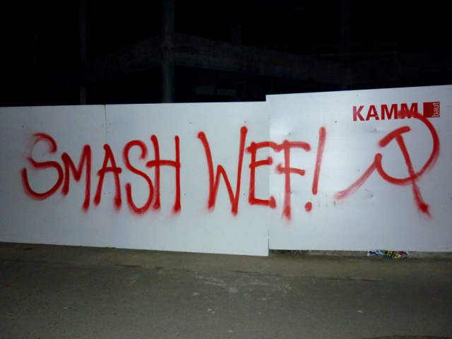 Zur Mobilisierung zu den Protesten gegen das Weltwirtschaftsforum, das 2015 wieder in Davos stattfindet, wurden in den letzten Tagen in der Schweiz mehrere Filialen der Credit Suisse angegriffen, darunter in Zürich und in Köniz. Zuvor wurden auch andere Unternehmen zu Zielen, darunter Adecco und RUAG Defence.