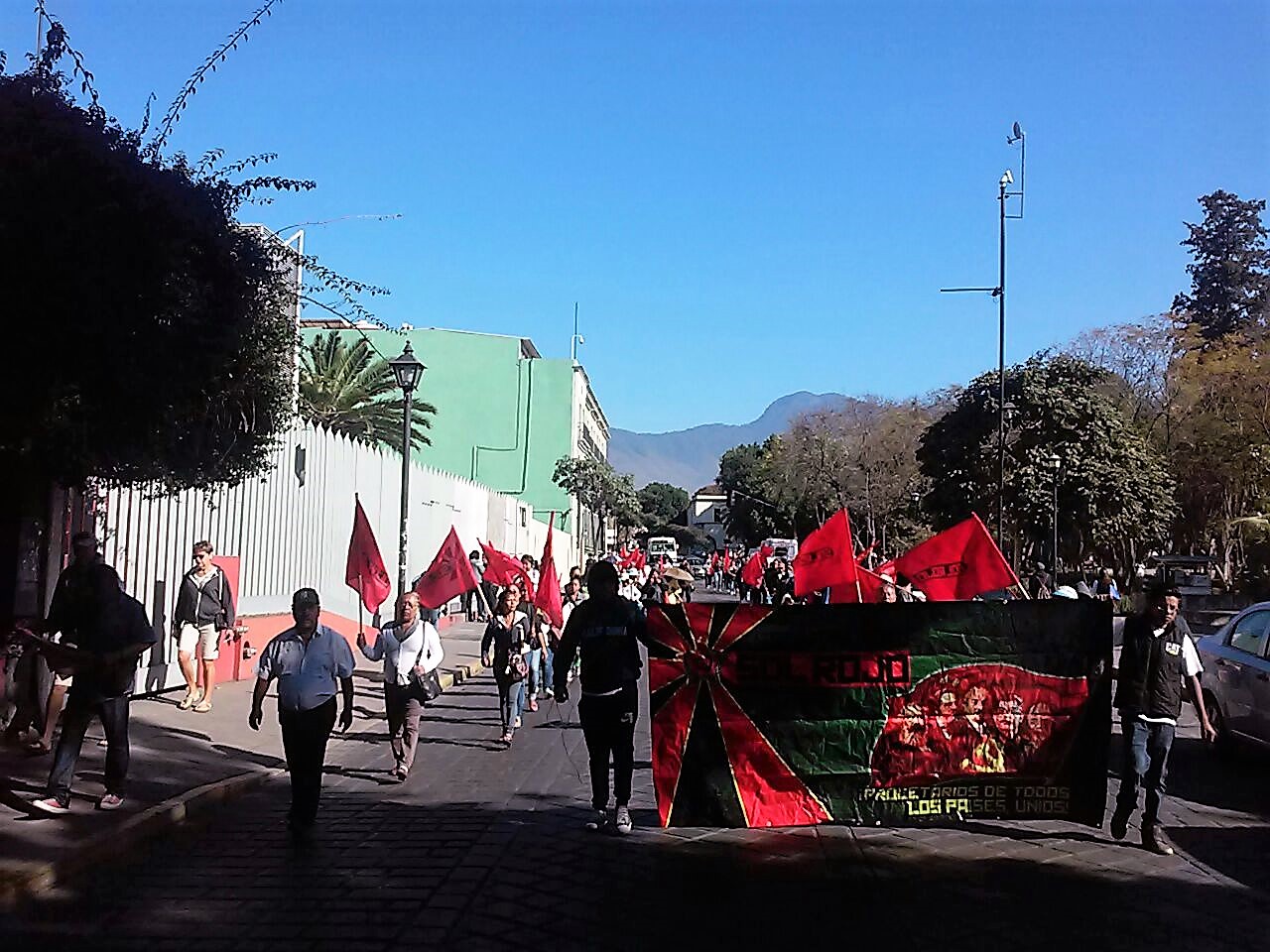 Konkret machen wir die Parolen der Volksbewegung, entwickeln den Klassenkampf gegen die Durchsetzung der Politiken gegen das Volk, gegen die Megaprojekte des Imperialismus, gegen die Gasolinazo [Anm. d. Übers.: Benzinpreiserhöhungen], gegen die Krise, gegen den Staatsterrorismus, für die Freiheit der Genossen der Bewegung, die politische Gefangene des Staates sind und üben, natürlich, den antiimperialistischen proletarischen Internationalismus aus.