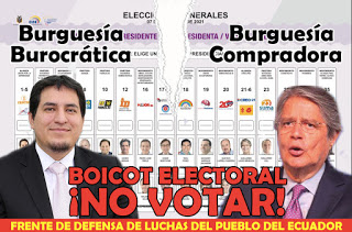 Die erste Runde der Wahlen ist vorbei. Nach einem gerissenen Verfahren, das einer veralteten Demokratie würdig ist, belegte Arauz (bürokratische Bourgeoisie), Vertreter des korrupten und faschistischen Reformismus, mit 32,71% der Stimmen den ersten Platz. Lasso, Vertreter der Kompradorenbourgeoisie, der Bankiers, Großkaufleute, Importeure, Grundbesitzer, erzielte 19,71 % der Stimmen.