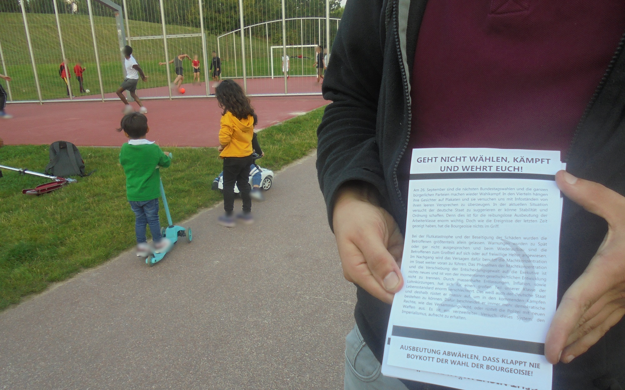 Am 26. September sind die nächsten Bundestagswahlen und die ganzen bürgerlichen Parteien machen wieder Wahlkampf. In den Vierteln hängen ihre Gesichter auf Plakaten und versuchen mit Inforständne uns von ihren leeren Versprechen zu überzeugen. In der aktuellen Situation versucht der deutsche Staat zu suggerieren er könnte Stabilität und Ordnung schaffen. Denn diese ist für die reibungslose Ausbeutung der Arbeiterklasse enorm wichtig. Doch wie die Ereignisse der letzten Zeit zeigen hat die Burgeoisie nichts im Griff.