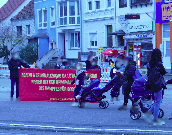 „Das brasilianische Volk kämpft! Vor allem der Kampf der armen und landlosen Bauern um den Boden, der ihnen unrechtmäßig genommen wurde vom brasilianischen Staat und den Großgrundbesitzern ist von großer Bedeutung.“ - so begann das Flugblatt des Roten Frauenkomitee Bremen, das am Samstag, den 30. Oktober 2021 an verschiedenen Orten in Bremen verteilt worden ist. An gleich drei Plätzen führte das Rote Frauenkomitee Bremen spontan Kundgebungen durch, mit denen sie zur Solidarität mit dem Kampf der armen und landlosen Bauern in Tiago dos Santos und Ademar Ferreira aufriefen.