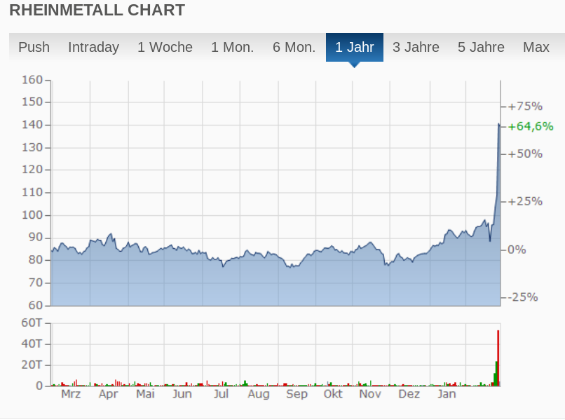 Gutes Beispiel ist Rheinmetall. Der Rüstungskonzern hat seit dem 24. Februar 2022 ein mächtiges Hoch im Aktienkurs zu verzeichnen. So ist der Kurs, Stand 01. März 2022, um 42,3 Prozent gestiegen. Es ist der höchste Aktienwert, den der Konzern seit 10 Jahren verzeichnen kann. Gleichzeitig brachte sich Rheinmetall auch für die Aufrüstungspläne der BRD ins Spiel. So bot Rheinmetall-Chef Armin Papperger an: „Wir haben für das Ministerium aktuell Listen aufgestellt, was kurzfristig verfügbar wäre. Wir als Rheinmetall könnten in kurzer Zeit Ausrüstung im Wert von 42 Milliarden Euro liefern.“ Darüber hinaus seinen innerhalb von zwölf Monaten logistische Fahrzeuge, innerhalb von 18 Monaten Radfahrzeuge und innerhalb von 24 Monaten auch Kettenfahrzeuge lieferbar.