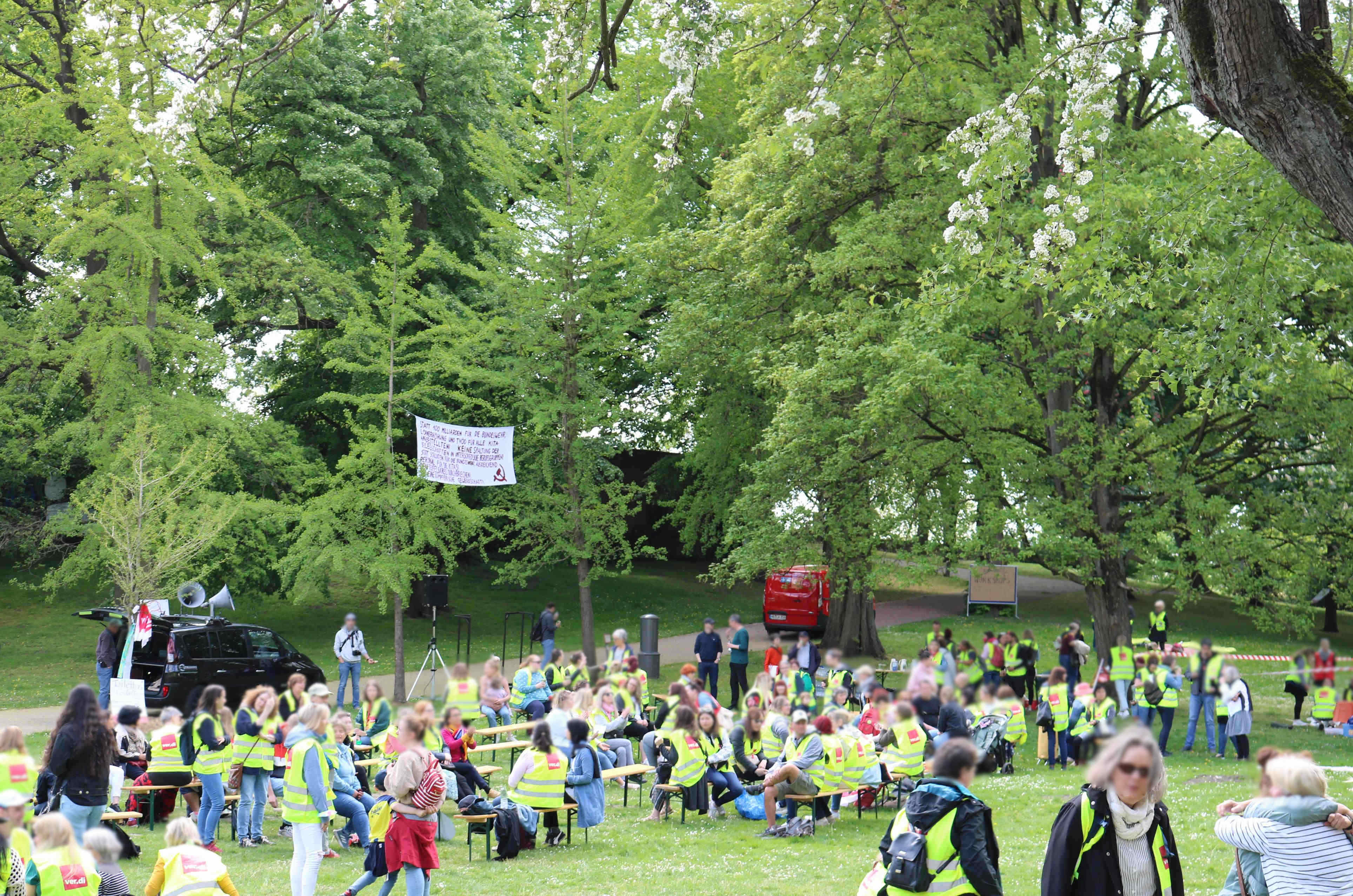 Am Donnerstag, den 12. Mai versammelten sich über 400 Bremer Kita-Beschäftigte in den Wallanlagen zum Warnstreik, zu dem die Gewerkschaft ver.di aufgerufen hatte.