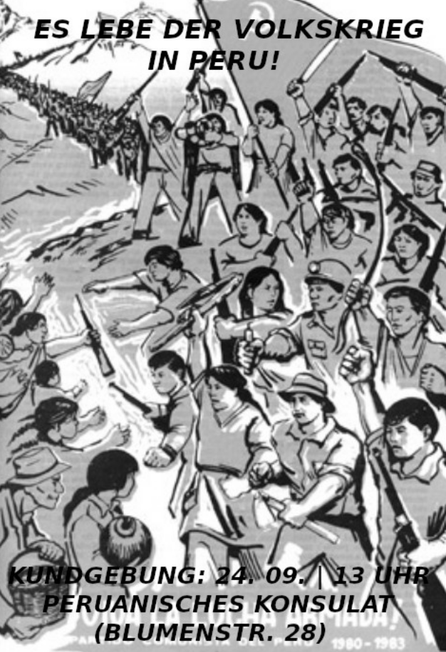 Der 24. September ist der Jahrestag der Rede des Vorsitzenden Gonzalo, die er hielt, als er kurz nach seiner Gefangennahme der Weltpresse in einem großen Käfig und in Sträflingskleidung präsentiert wurde. Er nutzte diese letzte Gelegenheit, um zum peruanischen Volk und zur Kommunistischen Partei zu sprechen. Und wie er sagte, ist es nur eine Krümmung im Weg des Volkskriegs. Doch trotz allem konnte der Volkskrieg in Peru nie besiegt werden. Trotz der absoluten Nachrichtensperre der peruanischen Medien, dringen immer wieder Aktionen der Kommunistischen Partei an die Öffentlichkeit, die zeigen, dass sie da ist und der Kampf weiter geht. Darum braucht es auch heute Solidarität mit dem Kampf des peruanischen Volkes. Damit der Volkskrieg wieder zu voller Kraft kommen kann und eine neue Gesellschaft entsteht. Denn nicht der Volkskrieg und die KPP sind es die Völkermord begehen, sondern die reaktionären Regierungen von der eine schlimmer ist als die andere und die Imperialisten, die das Land ausplündern. Doch am Ende werden sie von der peruanischen Revolution hinweggefegt werden.