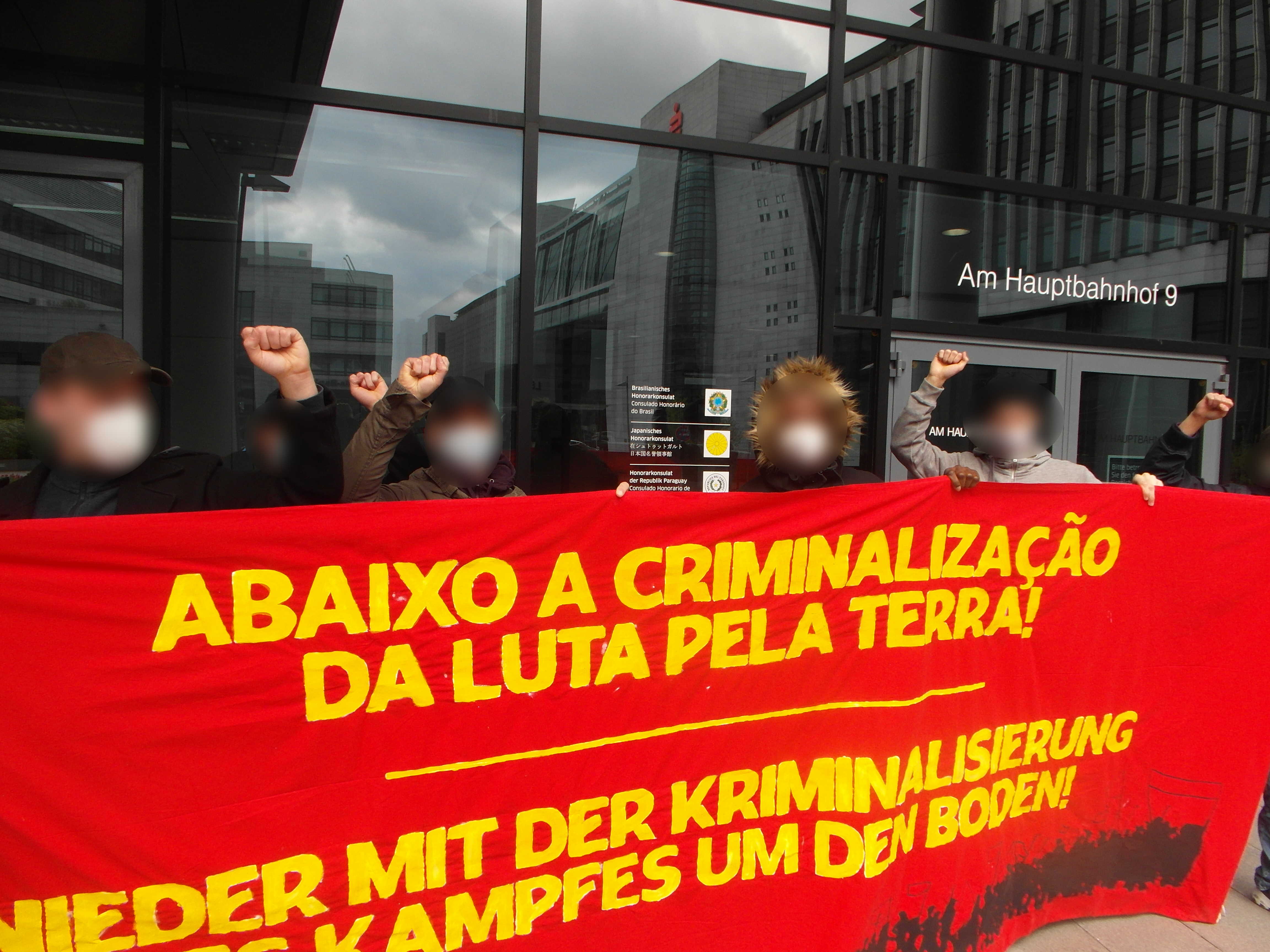 Sie trugen ein Banner mit der Aufschrift "Nieder mit der Kriminalisierung des Kampfes um den Boden!" auf deutsch und portugiesisch.