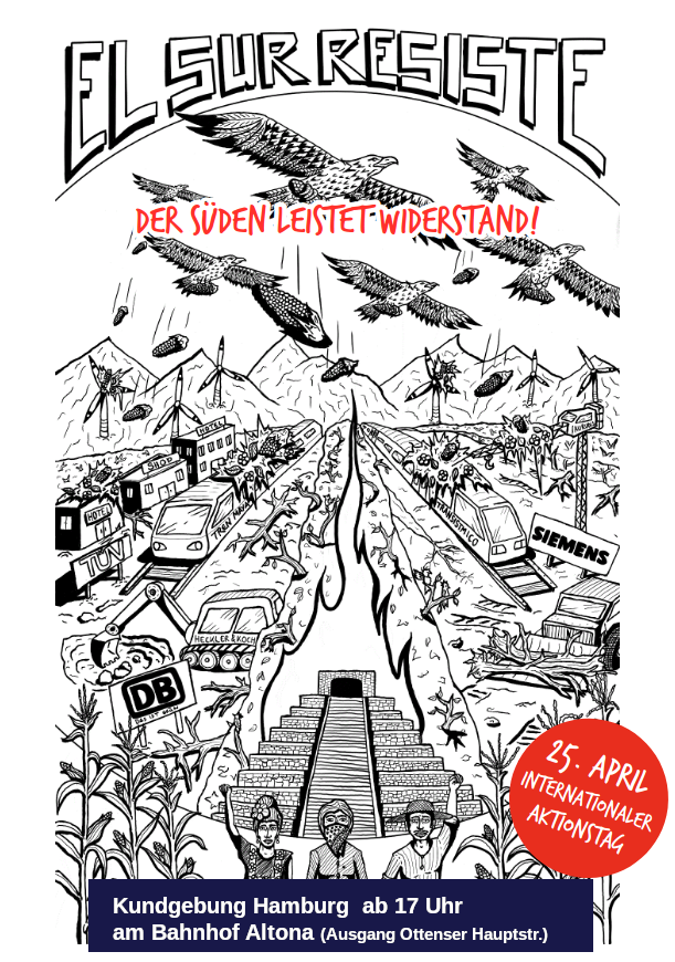 Gegen diesen Öko- und Ethnozid leisten viele indigene Gruppen des nationalen Indigenenkongresses (CNI) Widerstand. Um ihre lokalen Kämpfe zu verbinden, die Zerstörung und Vertreibung öffentlich anzuprangern und Druck auf die Verantwortlichen auszuüben, organisieren sie vom 25. April bis 5. Mai 2023 eine Karawane unter dem Motto “Der Süden leistet Widerstand“. Als Netz der Rebellion, das sich seit dem Besuch der indigenen Zapatistas aus Mexiko 2021 in Europa bildet, kämpfen wir gegen die Beteiligung europäischer Unternehmen und unterstützen die Karawane von Deutschland aus.