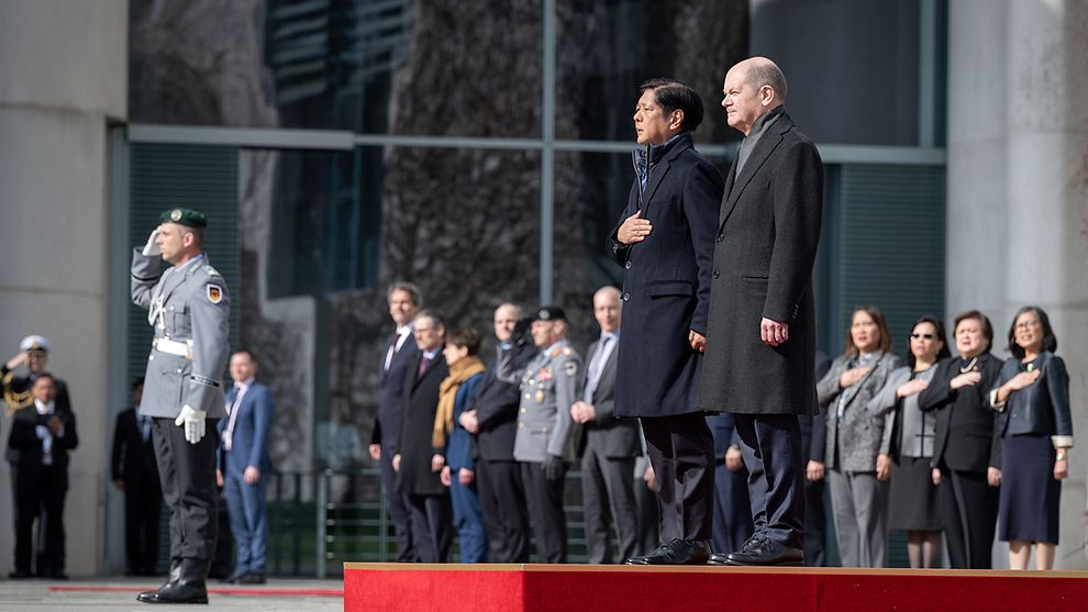 In einer gemeinsamen Pressekonferenz sprach Scholz unter anderem über philippinische Bodenschätze, „die für die europäische und die deutsche Wirtschaft wichtig sind, Nickel zum Beispiel“. Marcos Jr. sprach mehr über militärische Aspekte des Treffens. Dabei unterstrich er, dass „Deutschland die Streitkräfte meines Landes seit 1974 mit Ausbildung geholfen“ hat. Somit sei Deutschland der „zweitälteste formelle Verteidigungspartner der Philippinen, und ich habe die Offenheit meiner Regierung bekundet, was Diskussionen über eine Zusammenarbeit anbetrifft, die über die Ausbildung hinausgeht und auch Bereiche wie den Cyber- und den maritimen Bereich betrifft“. Auch der Aufbau von Kapazitäten und Fähigkeiten der Küstenwache durch Deutschland wurde eingefordert. Auf Nachfrage unterstrich Marcos Jr.: „Wir haben einen intensiven Austausch mit der Bundesrepublik Deutschland auch im Bereich der Ausbildung der Streitkräfte und der Küstenwache meines Landes. Wir haben uns mit dem Bundeskanzler darauf geeinigt, dass wir das ausweiten wollen.“ Er ließ es sich auch nicht nehmen, deutsche imperialistische Monopole, wie Siemens, Lufthansa, die Deutsche Bank, Bayer, Bosch zur Ausplünderung der Philippinen einzuladen.