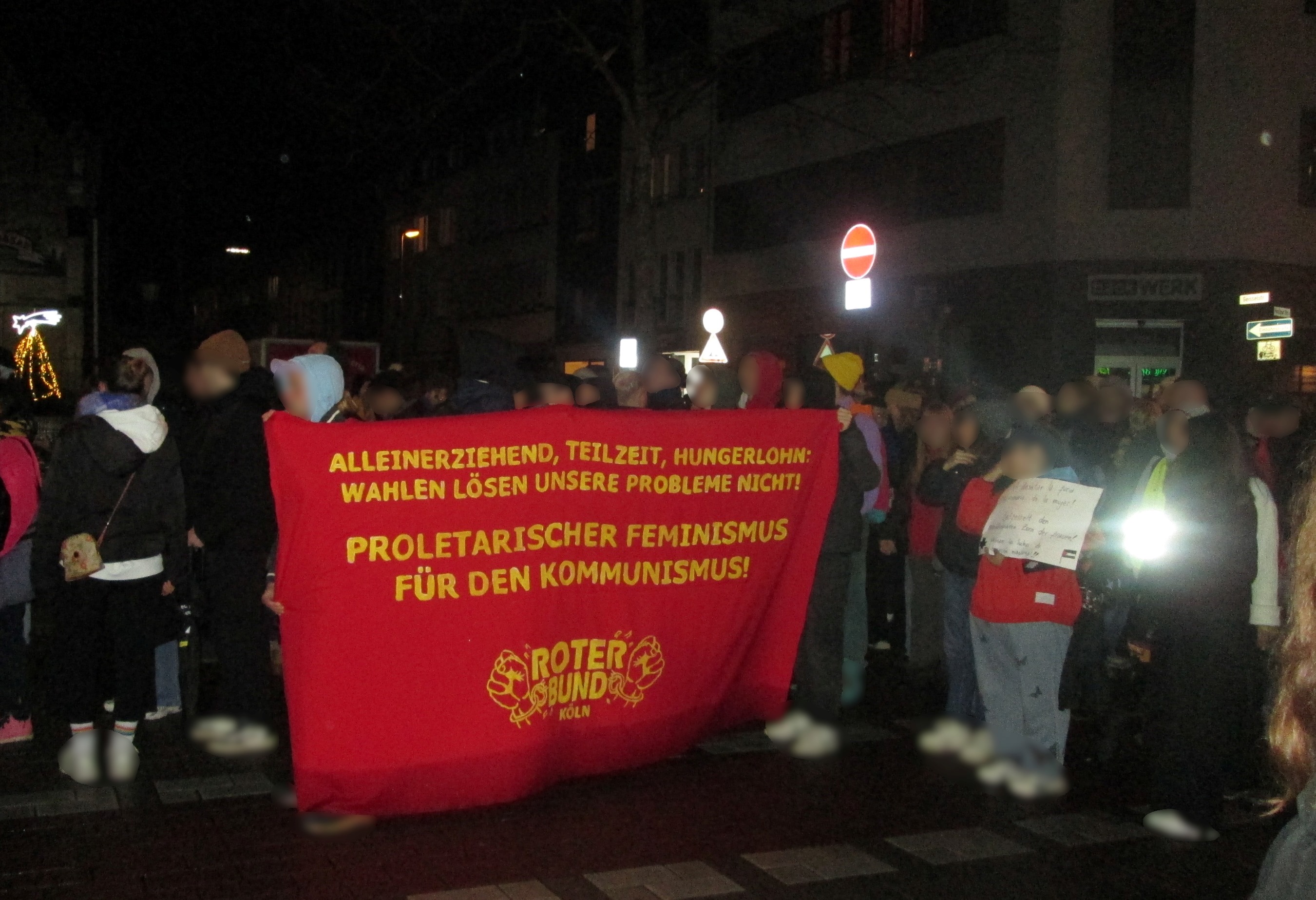 „[…] Gemeinsam mit weit über tausend anderen Demonstrationsteilnehmern sind wir am Montag kraftvoll vom Barthonia-Forum durch Ehrenfeld zum Hans-Böckler-Platz gezogen. Anders als bei vergleichbaren Aktivitäten in der Vergangenheit haben wir uns dieses mal im Mittelfeld der Demonstration eingereiht, wo oft Slogans, Parolen und Redebeiträge von Vorne nicht ankommen und wo unseren kurzen Redebeiträge zu Themen bzgl. der Gewalt gegen Frauen, der größeren Ausbeutung der Frauen, proletarischen Feminismus und die Rolle der Frauen in den antiimperialistischen Kämpfen auf einigen Widerhall und Zustimmung stießen. So stellten wir unter anderem fest: