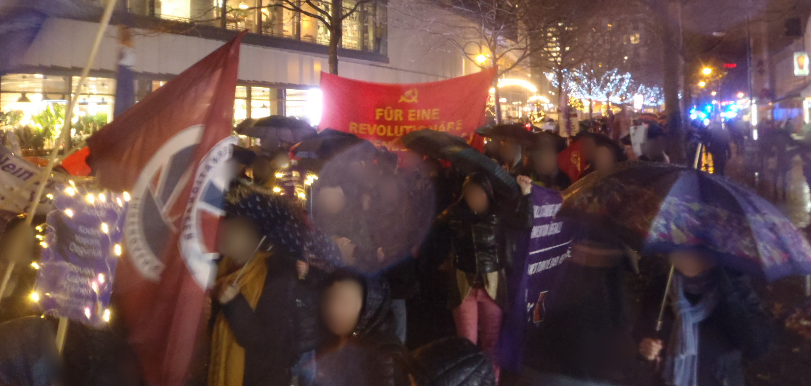Parolen wie „Alleinerziehend, Teilzeit, Hungerlohn – Frauen, kämpft für die Revolution!“, „Rebellion in Wort und Tat, Feuer und Flamme dem Patriarchat!“ und „Hoch die internationale Solidarität!“ wurden lautstark angestimmt und somit die Untrennbarkeit des Kampfes der Frau gegen das Patriarchat und des Kampfes des Proletariats und der unterdrückten Völker gegen den Imperialismus hervorgehoben. Trotz der ungünstigen Umstände wurden zahlreiche Flugblätter mit dem Aufruf, sowie Flugblätter für den am 6. Dezember in Hamburg stattfindendenVortrag zu Georges Ibrahim Abdallah verteilt. Broschüren mit dem Programm und den Prinzipien der Roten Frauenkomitees – BRD wurden ebenfalls an Interessierte verteilt.