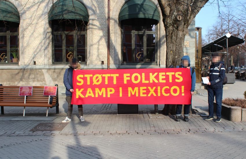 On Thursday April 13th activists from Kampkomiteen (The Struggle Committee) in Trondheim organised a manifestation in support of the Mexican People. The activists stood with a banner with the slogan ”Support the struggle of the people in Mexico!” and leaflets with the slogan ”The Interoceanic Corridor (CIIT) plunders and kills poor peasants and indigenous peoples in Mexico!” were distributed in great quantity.