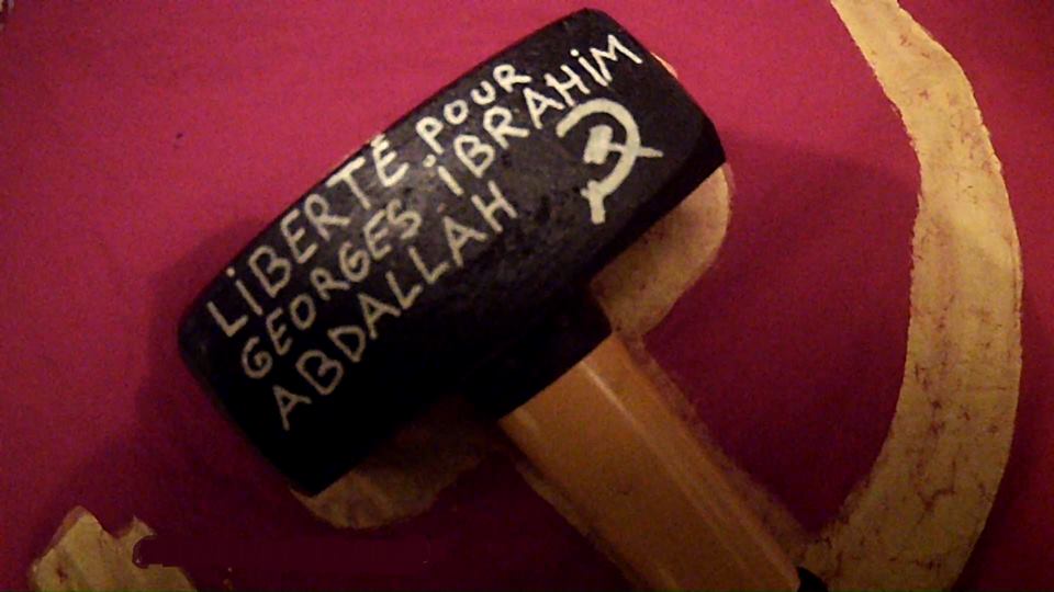 Hence, demanding Abdallah release, french activists attacked the Israeli consulate in Marseilles on the night from Tuesday to Wednesday by smashing in its windows. In a declaration send to and documented by french comrades, a picture of the hammer used (and which was reportedly also left behind) is depicted. On it, the slogans “Freedom for Georges Ibrahim Abdallah” and “Group Pierre Oller” are written and two Hammer and Sickles drawn.