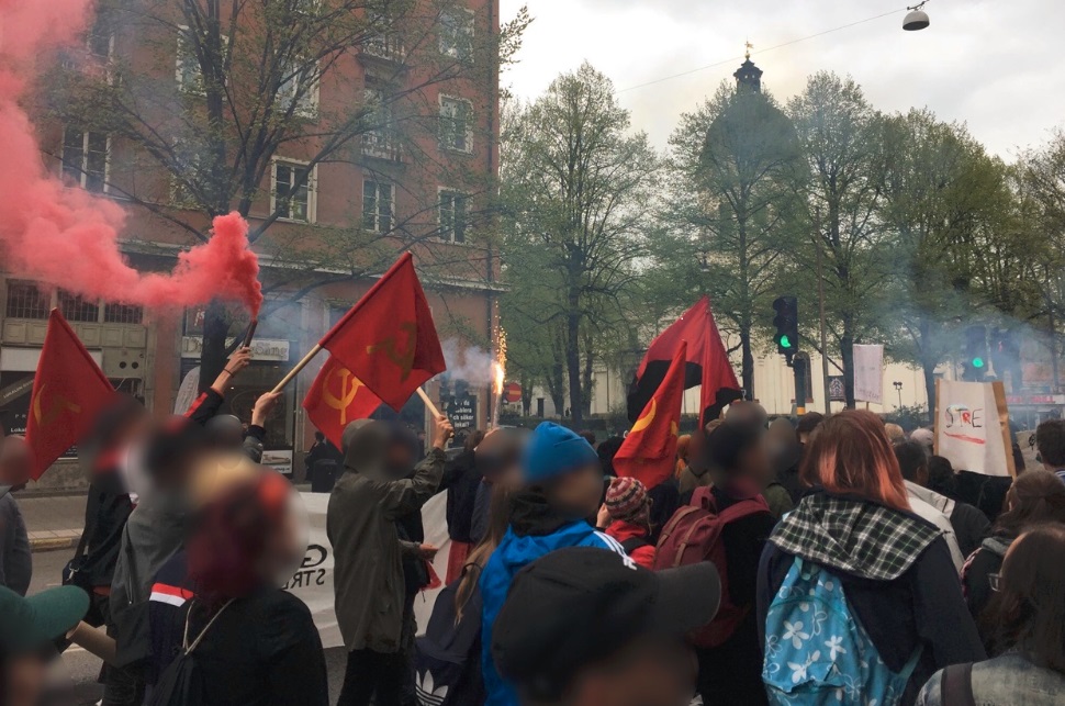 Last weekend, yet another manifestation took place following the same procedure as before: Gathering at a starting point in Stockholm a manifestation is held from which several more or less independent actions are being developed. Swedish communists, in a show of force, participated in a combative demonstration in which masked participants shouted slogans, raised the banner with hammer and sickle and torched red flares. When the police – who was repeatedly provoking the demonstration – attempted to take participants of the march into custody, the forces of repression were repelled by joint effort, only to retaliate later by indiscriminately pepper spraying the demonstration.