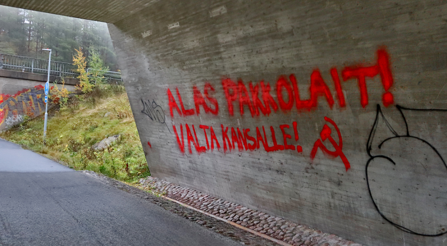 Comrades from Punalippu report that a grafitti action has taken place in Tampere against the anti-people coercive laws approved by the Finnish parliament, which cuts off worker’s rights to trike. A mural in Tampere writes in Finnish: ”Down with the coercive laws! Power to the people!”.