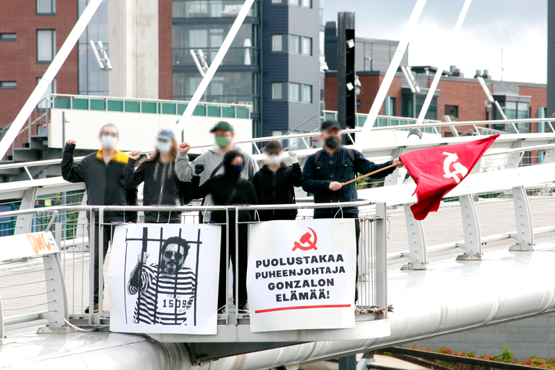 A manifestation was held in Tampere calling to support the campaign to defend the life of Chairman Gonzalo, leaflets were distributed and a speech was held on the current situation at one of the central squares in Tampere, with a focus on the statement made by the Peru's Peoples Movement on the matter. All of this was complemented by signs hanged on a bridge in the city.