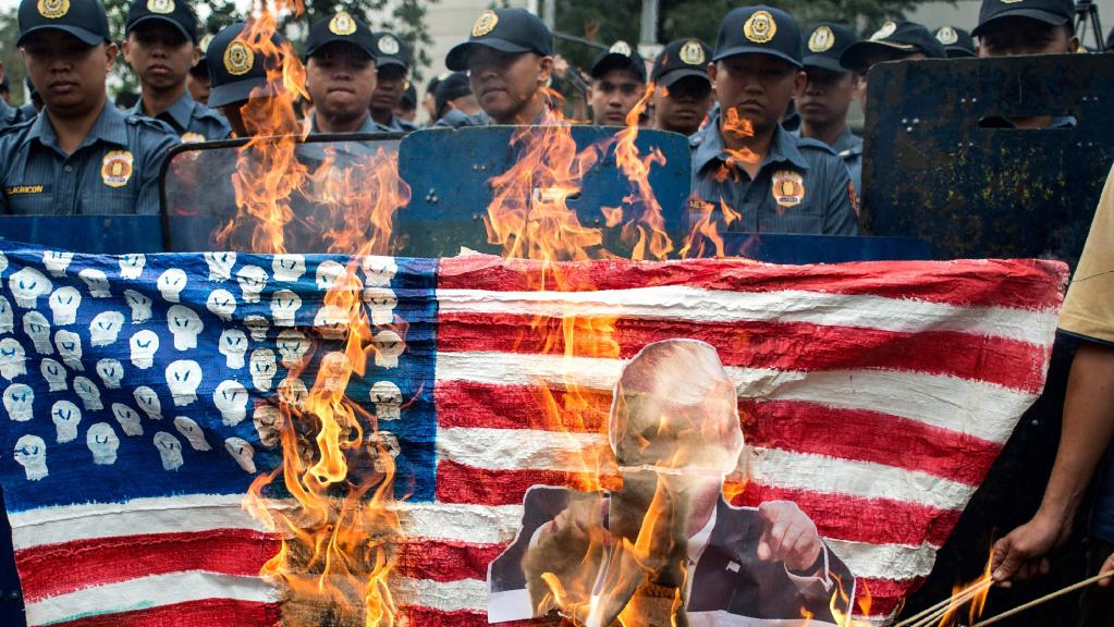 Hence, even before the arrival of US President Trump to Manila, popular protests erupted in the countries capital becoming more organized in the days to follow. In the demonstrations, many US flags and images of Trump were burnt to the people shouting “Down with US-imperialism”. More than once, demonstrations confronted the police in order to flatten their way towards the US embassy, forcing the Philippine riot police to be aided by the fire departments water canons and even deploying new weaponry tailored to dispersing protesters.