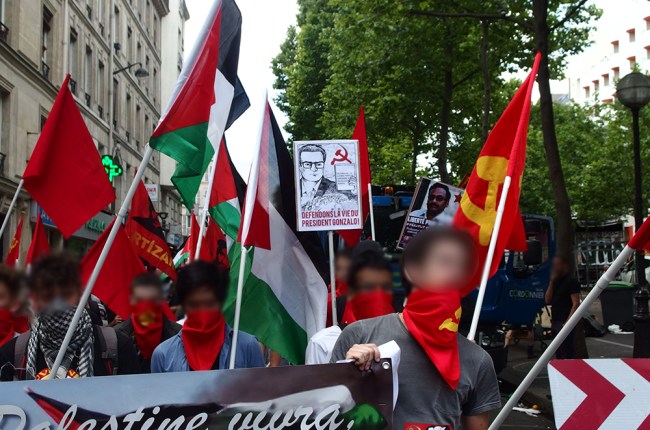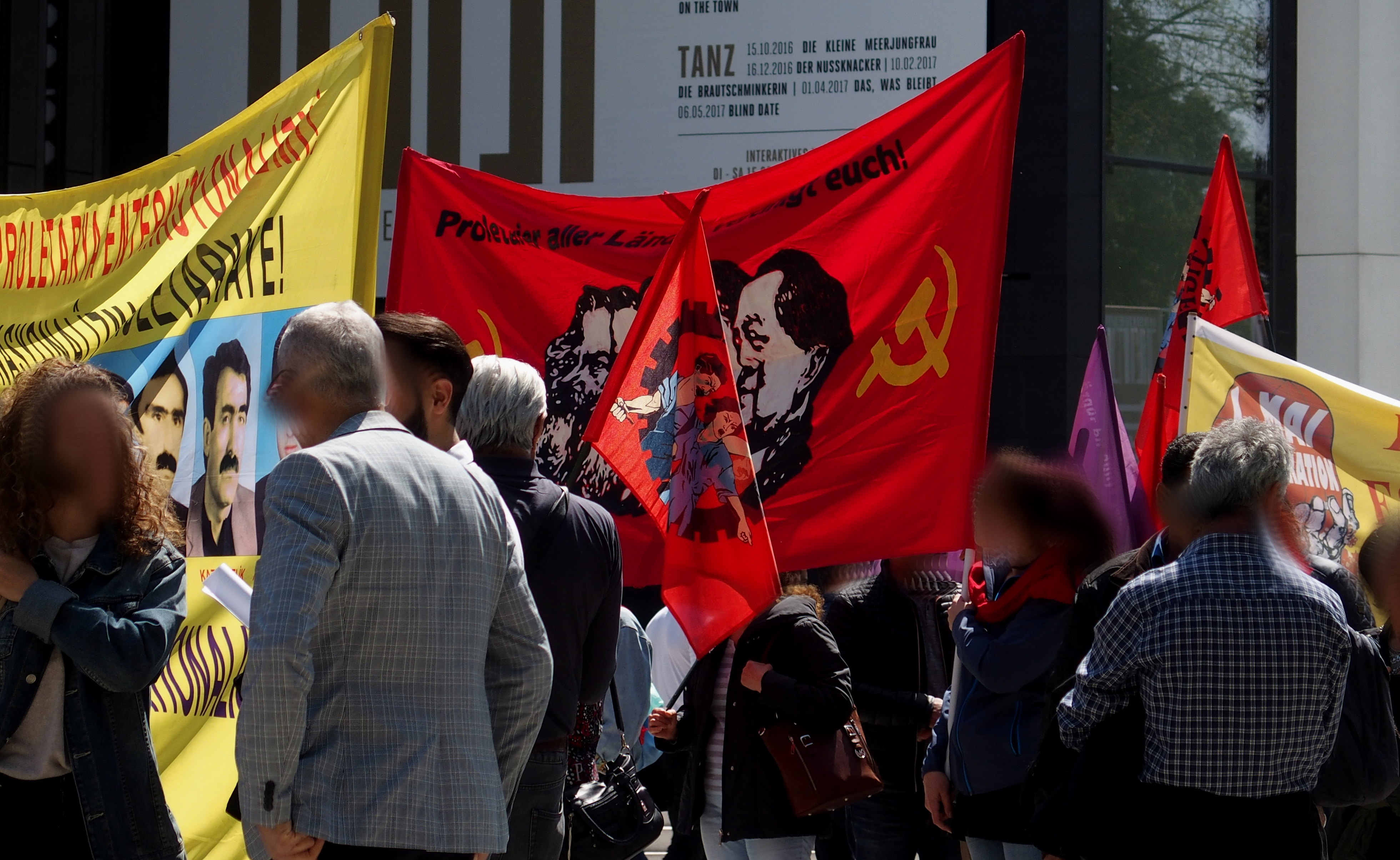 In Hamburg the "League against imperialist aggression" organised the internationalist bloc on the DGB demonstration, which once again led to the Fish Market of Hamburg, where the social fascists of the yellow trade unions and the SPD organized an election campaign for the upcoming elections in September. The internationalist bloc, with 1500 participants, opposed this with proletarian internationalism and a combative mood. As in the previous year, the front transparent of the bloc read, "Proletarians of all countries and peoples of the world, unite!" There were mainly revolutionaries from the oppressed countries, especially from Turkey, sympathizers of ADHK, ATIK, the People 's Front, the Palestinian liberation struggle and the struggle of the peoples of Latin America. But there was also a greater participation among the revolutionaries from the FRG than previous years, which shows that the struggle for the realisation of proletarian internationalism and against its degradation to an empty phrase is an important contribution to the struggles in the oppressed and the imperialist countries. It also involved a collective of workers, who denounced the working conditions at DHL with their own banner in the front block. In the speeches held, imperialist aggression, particularly against the countries of West Asia, were repeatedly condemned. The meeting of the imperialists and their lackeys in Hamburg in July at the G20 summit was rejected and the bloc made it clear that the anti-imperialist forces of the city are willing to bring the joint protest on the streets. The determined and united appearance of the block also prevented the uniformed minions of the reaction from dubious attacks as as they did last year.