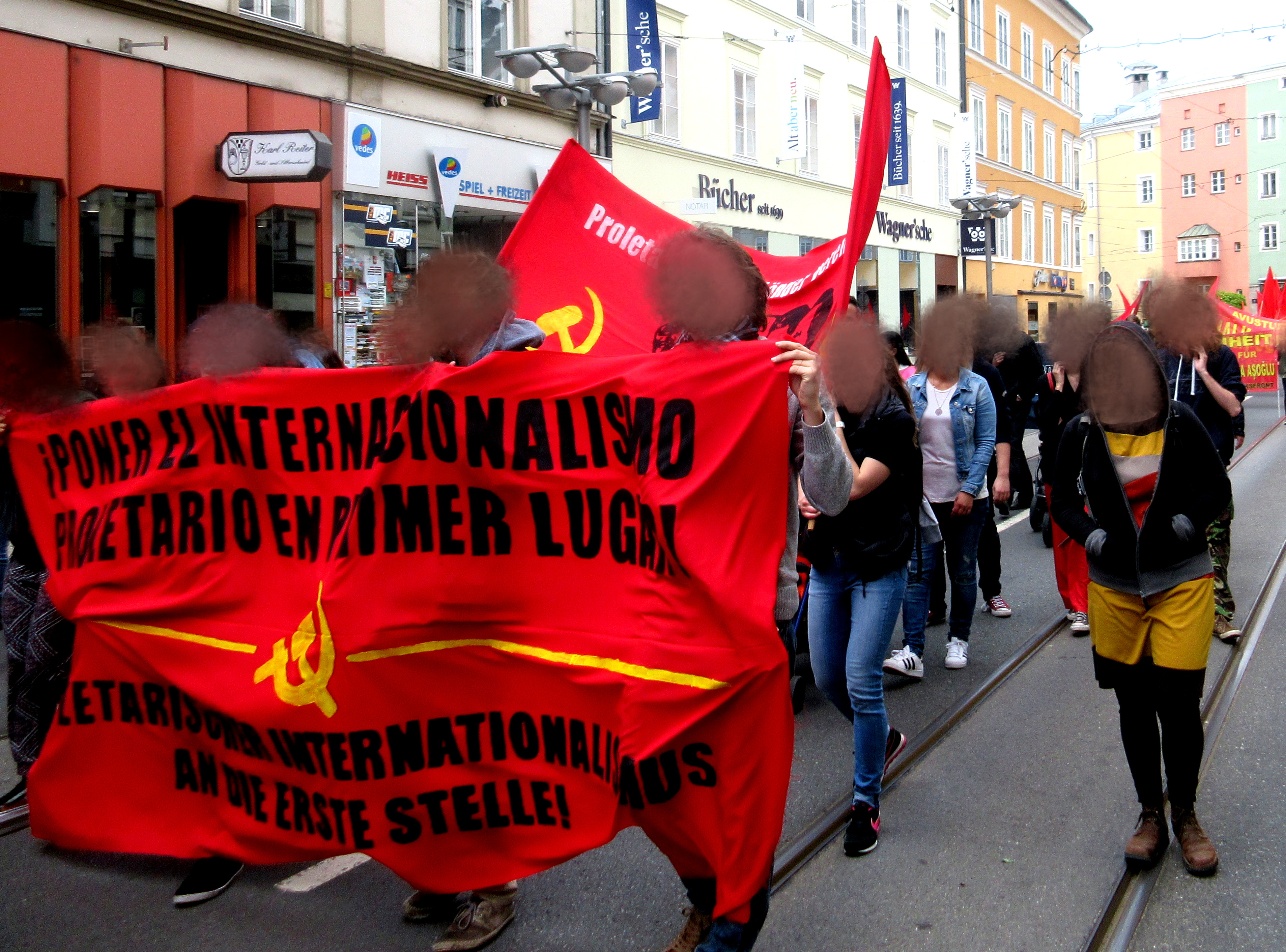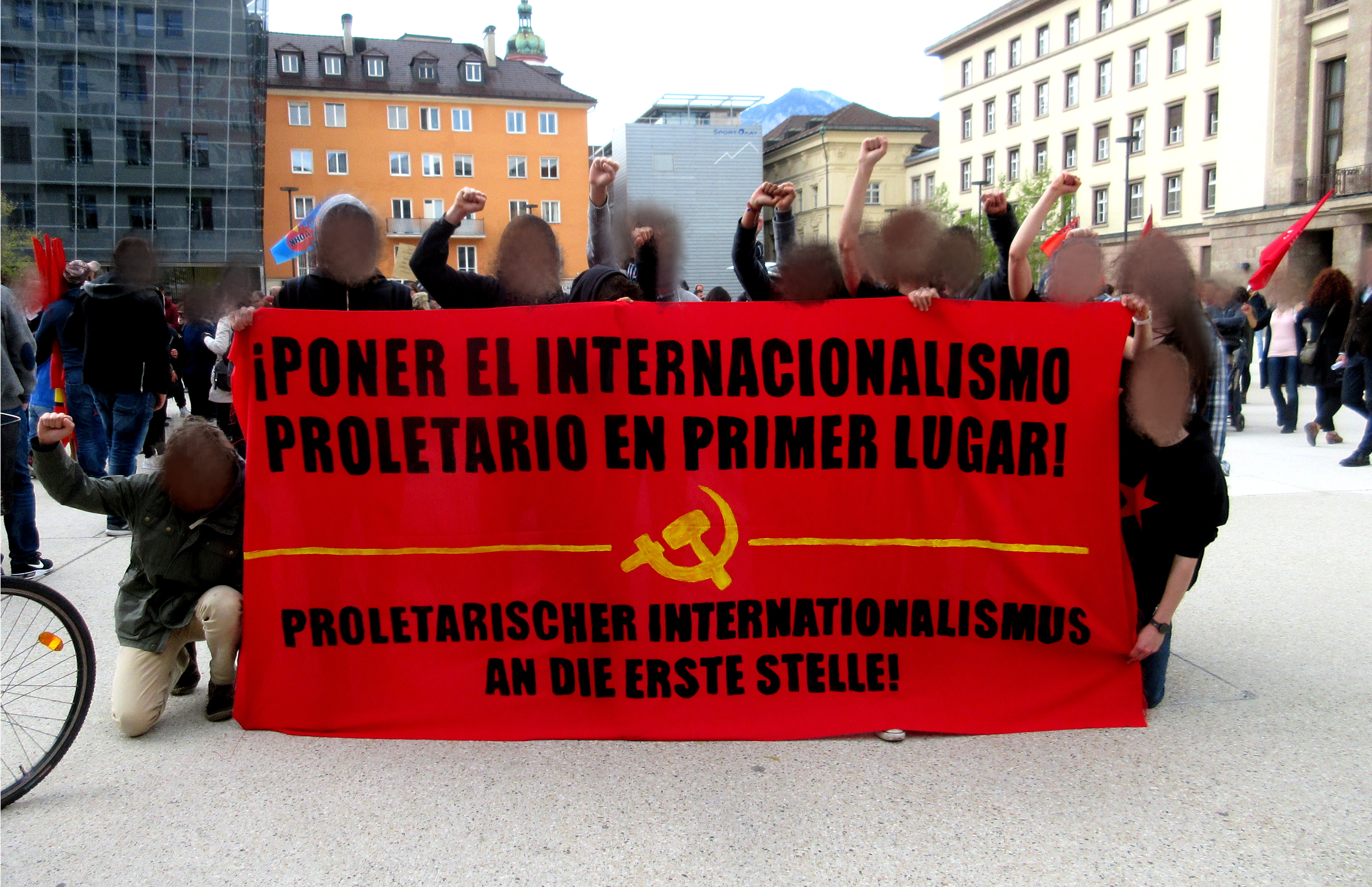 About 1000 People were part of the 1st of May Demonstration in Innsbruck, which was a lot more than last year. This day, the international day of struggle for the proletariat, had an important character, it was under the sign of 100 years Great Socialist October revolution and the Proletarian Internationalism. One banner which was carried was an expression for this, it had the Spanish slogan: “Poner el Internacionalismo Proletario en primer lugar!“ (Put the Proletarian Internationlism at the first place!”) on it and was welcomed by a lot of people.