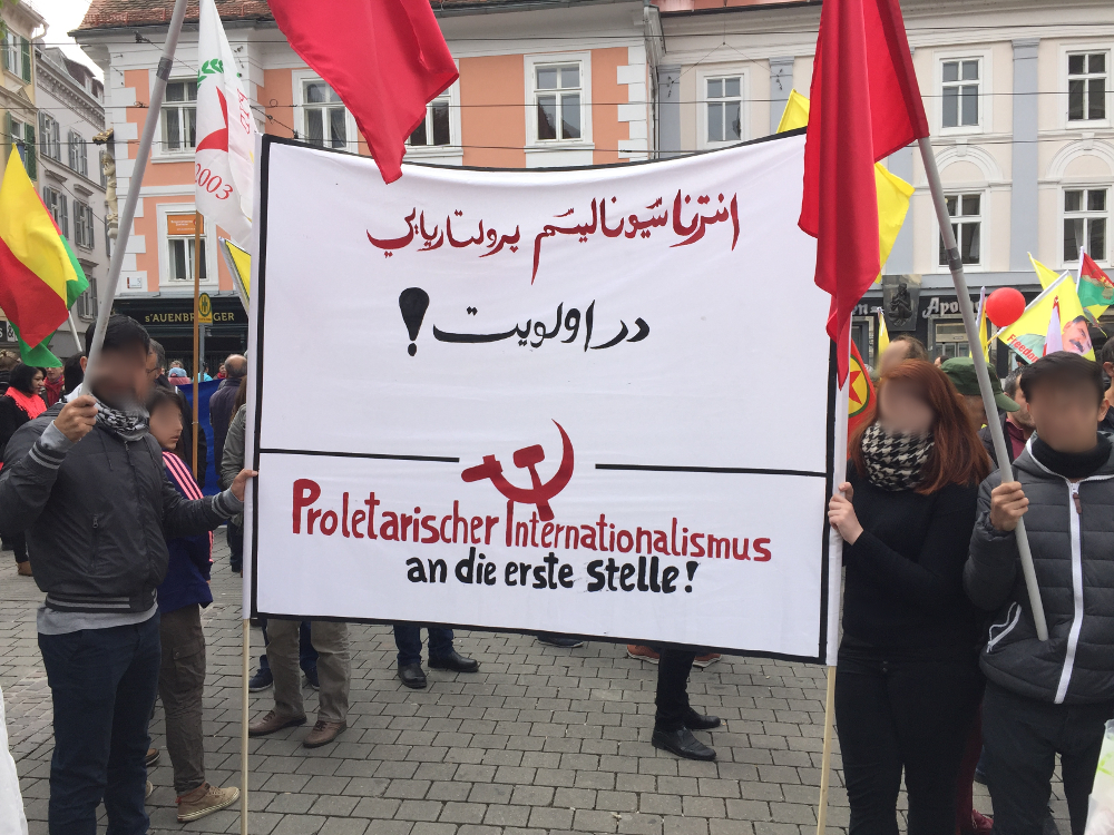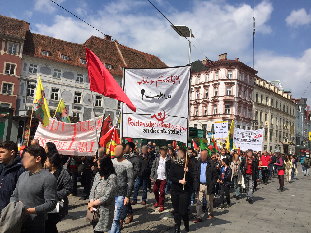 Different politically forces participated on the 1st of May Demonstration in Graz. Really eye-catching in the this year‘s demonstration was, that the revolutionary forces preliminary hold up proletarian internationalism very strongly in the front, which find‘s its expression especially in a one banner that was held in Persian and German language.