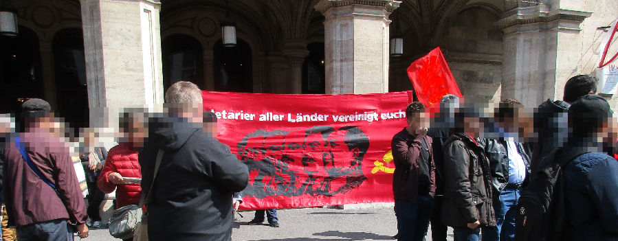 The international character of the 1st of may demonstration was shown by an huge participation of migrant democratic and revolutionary forces. Comrades from the Philippines, Palestine, Afghanistan and Turkey/Kurdistan demonstrated their resoluteness to hold up the liberation movements in their countries, in the sense of international solidarity and also to support he revolutionary process in Austria. One banner which was carried at the demonstration, with the English slogan „Put Proletarian Internationalism in the first place“ made an important political sign against Revisionism, which today is propagating Chauvinism. In parts of the demonstration there was spread an an lively and struggling atmosphere with short statements, which contained the main tendency for the revolution today and also showed that for the revolutionary forces there is no reason for defeatism.