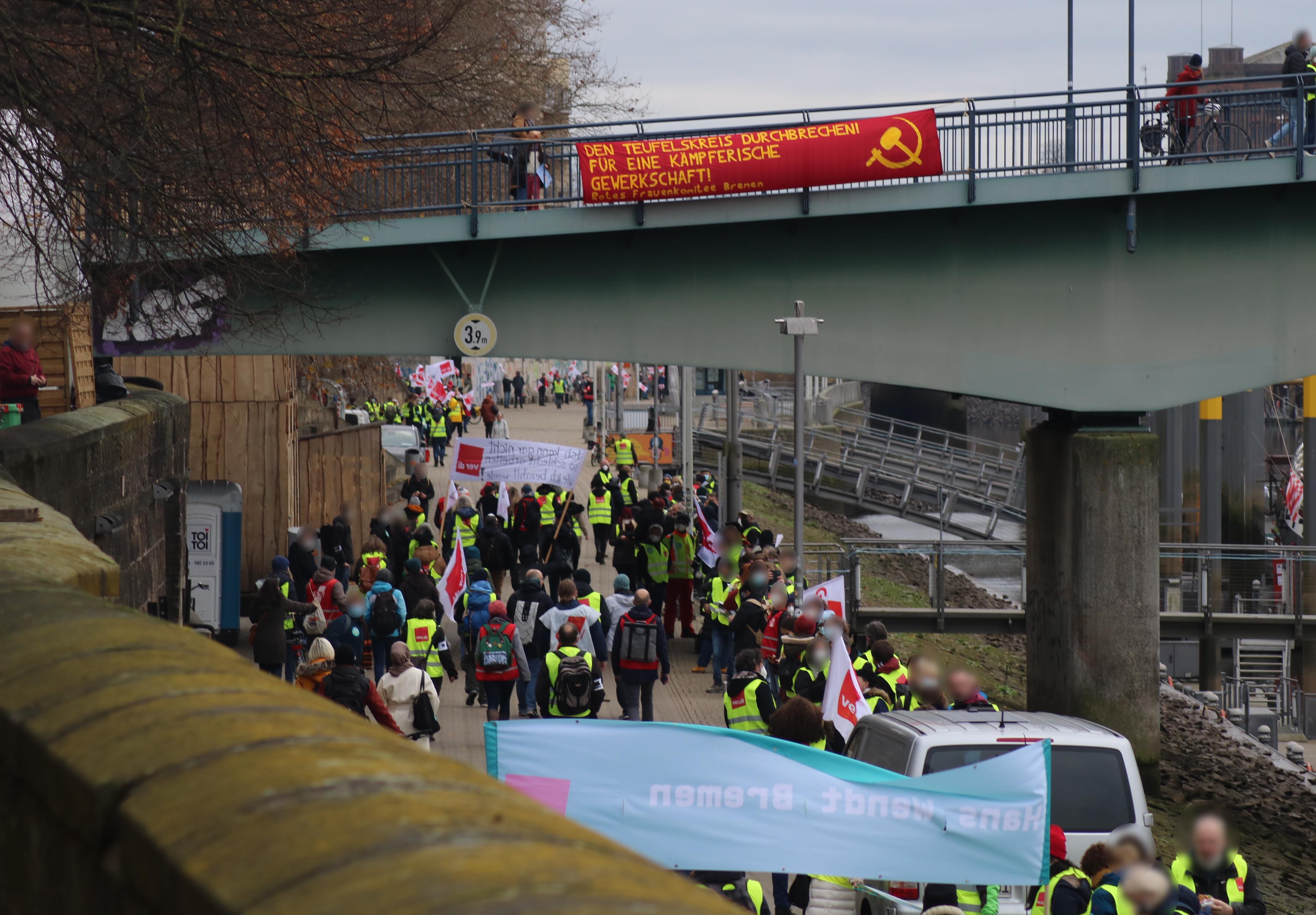 Almost 2,000 public sector employees went on strike for higher wages in Bremen on the 24th of November. The yellow unions ver.di and GEW and the cop union GdP had called for the warning strike on the occasion of the third round of negotiations in the bargaining dispute in the public service of the federal states and organised a star march of the different sectors to the riverside of the Weser, where a "people chain" was to be formed at the promenade and the adjacent bridges.