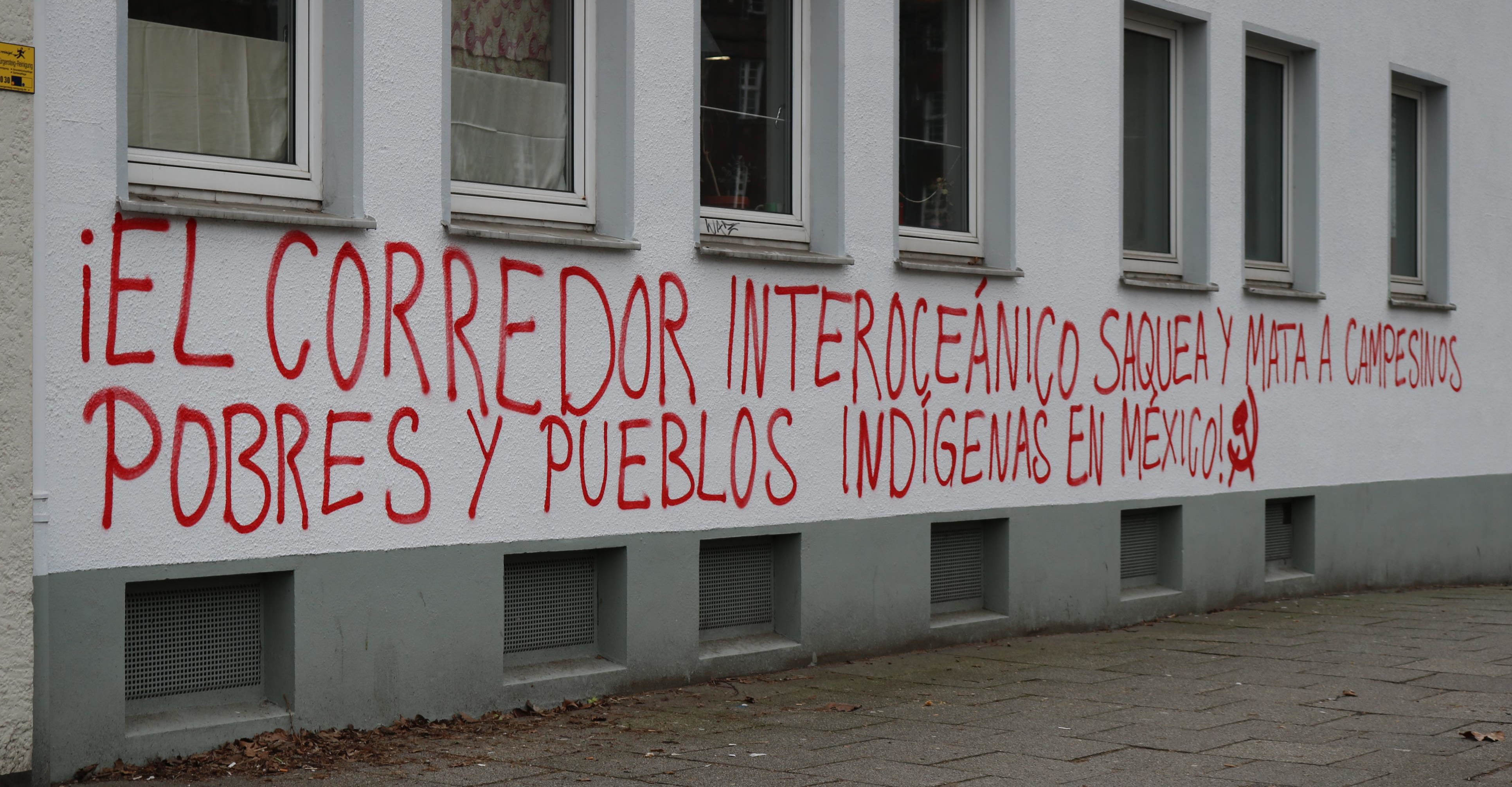 We document pictures of graffiti from Bremen, which denounce the crimes of the Interoceanic Corridor against the Mexican people, and which were sent to us. The graffiti are located around a hospital, where numerous Mexican nurses are exploited by German imperialism to worse conditions.