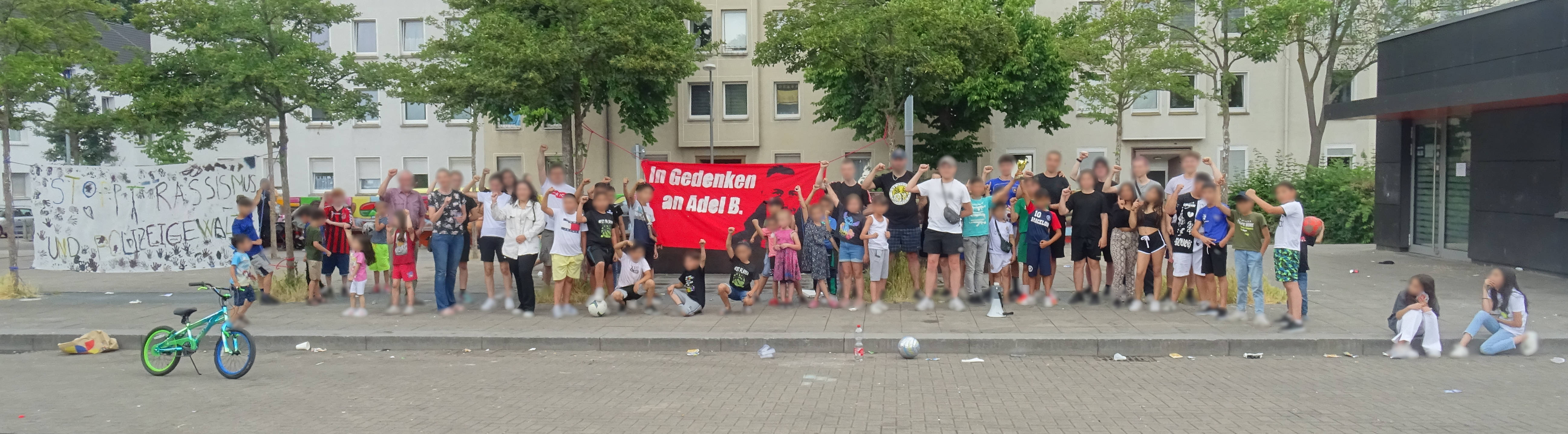 “We are gathered today on June 18 to, together, show our anger and sadness, because exactly four years ago today our friend and neighbor Adel B. was unjustly and brutally shot dead by the Essen police. We are also here to remember with determination and the courage to struggle who Adel really was and also, even four years after his killing by the police, to let all the tall tales and false suspicions told about him come to nothing.”