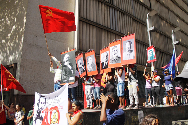 Promoted by the FRDDP, the march had a huge banner bearing the seal of celebration of the bicentenary of Karl Marx, portraits of the great communist leaders Marx, Engels, Lenin, Stalin and Chairman Mao. Just behind, two great portraits depicted Chairman Gonzalo and the Brazilian Communist leader Pedro Pomar, as well as flags of the participating movements.