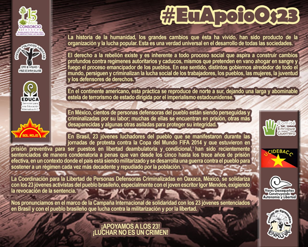 The Coordination for the Freedom of the Defenders of the Criminalized People in Oaxaca, Mexico, supports the 23 young activists of the Brazilian people, especially the young writer Igor Mendes, and we demand the revocation of the sentence.